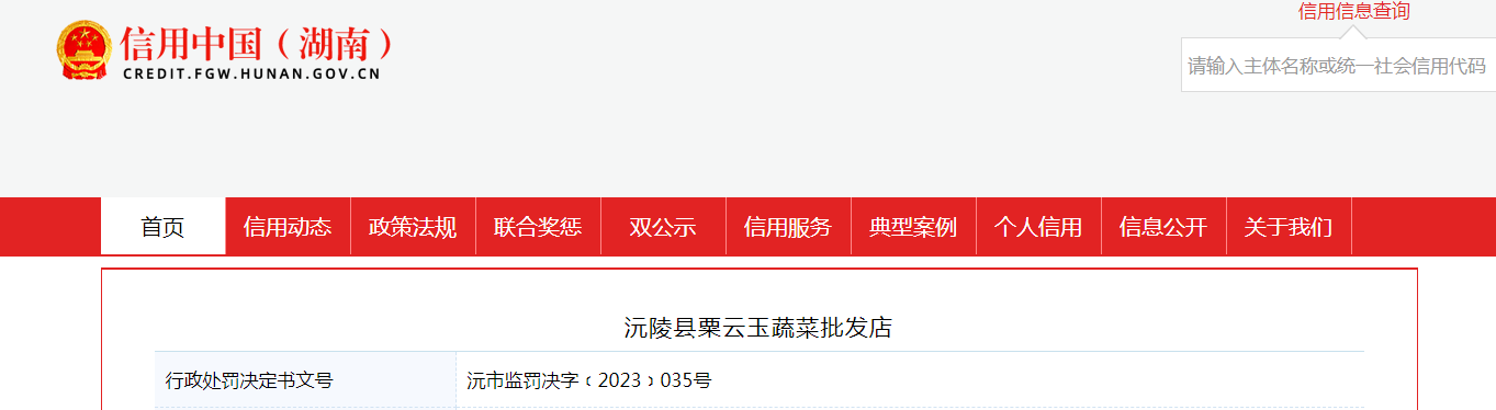 中國質(zhì)量新聞網(wǎng)訊 據(jù)信用中國(湖南)網(wǎng)站消息,近日,湖南省懷化市沅陵縣市場監(jiān)督管理局對沅陵縣粟云玉蔬菜批發(fā)店作出行政處罰。行政處罰決定書文號:沅市監(jiān)罰決字﹝2023﹞035號。