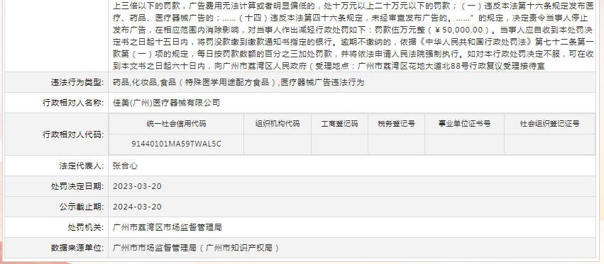 中國質(zhì)量新聞網(wǎng)訊 據(jù)信用中國(廣東廣州)網(wǎng)站消息,近日,廣州市荔灣區(qū)市場(chǎng)監(jiān)督管理局對(duì)佳美(廣州)醫(yī)療器械有限公司作出行政處罰。行政處罰決定書文號(hào):穗荔市監(jiān)處罰〔2023〕95號(hào)。