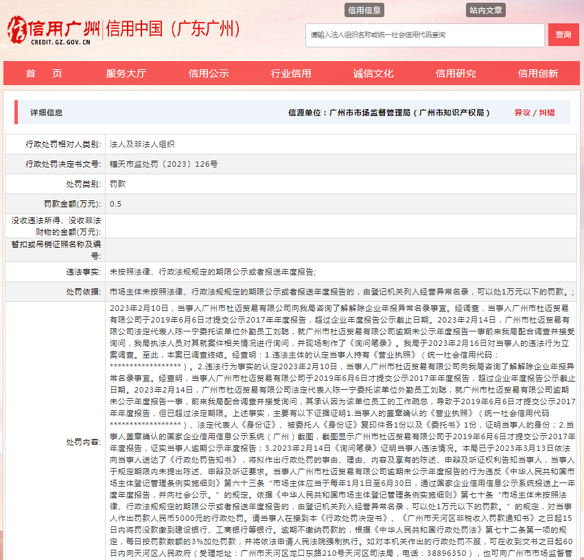 中國(guó)質(zhì)量新聞網(wǎng)訊 據(jù)信用中國(guó)(廣東廣州)網(wǎng)站消息,近日,廣州市天河區(qū)市場(chǎng)監(jiān)督管理局對(duì)廣州市杜邁貿(mào)易有限公司作出行政處罰。行政處罰決定書(shū)文號(hào):穗天市監(jiān)處罰〔2023〕126號(hào)。