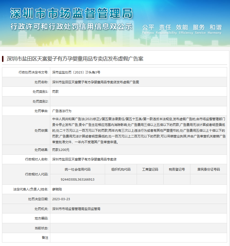 中國質(zhì)量新聞網(wǎng)訊 近日,深圳市市場監(jiān)督管理局鹽田監(jiān)管局發(fā)布行政處罰信息(深市監(jiān)鹽處罰〔2023〕沙頭角3號),涉及深圳市鹽田區(qū)天富愛子有方孕嬰童用品專賣店發(fā)布虛假廣告案。