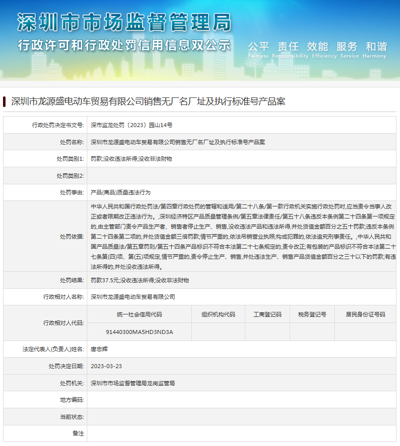 中國(guó)質(zhì)量新聞網(wǎng)訊 近日,深圳市市場(chǎng)監(jiān)督管理局龍崗監(jiān)管局發(fā)布行政處罰信息(深市監(jiān)龍?zhí)幜P〔2023〕園山14號(hào)),涉及深圳市龍?jiān)词㈦妱?dòng)車貿(mào)易有限公司銷售無(wú)廠名廠址及執(zhí)行標(biāo)準(zhǔn)號(hào)產(chǎn)品案。
