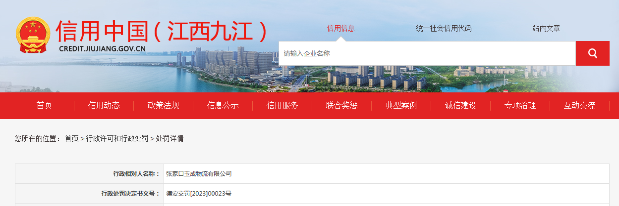 中國質(zhì)量新聞網(wǎng)訊 據(jù)信用中國(江西九江)網(wǎng)站消息,近日,江西省德安縣交通運輸局對張家口玉成物流有限公司作出行政處罰。行政處罰決定書文號:德安交罰[2023]00023號。