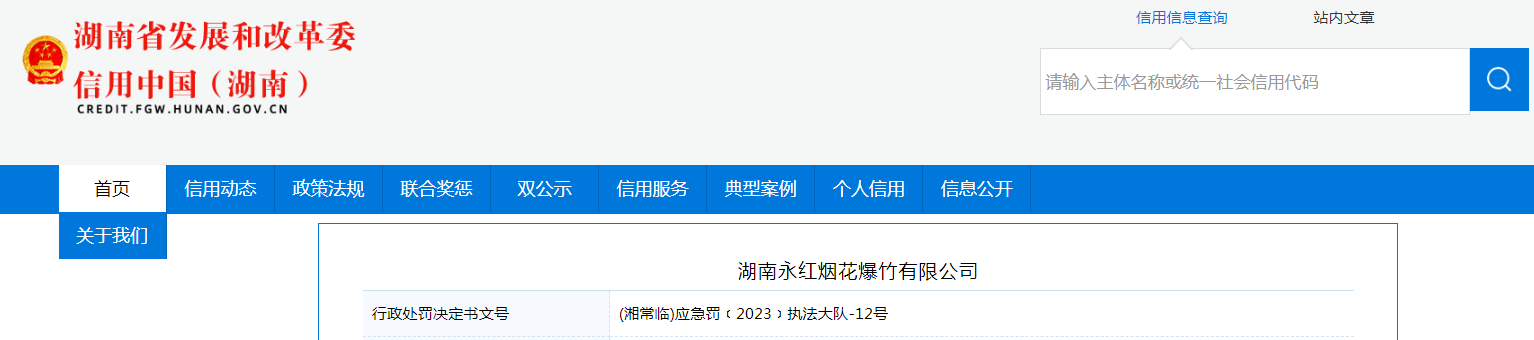 中國質(zhì)量新聞網(wǎng)訊 據(jù)信用中國(湖南)網(wǎng)站消息,近日,湖南省臨澧縣應(yīng)急管理局對湖南永紅煙花爆竹有限公司作出行政處罰。行政處罰決定書文號:(湘常臨)應(yīng)急罰﹝2023﹞執(zhí)法大隊-12號。