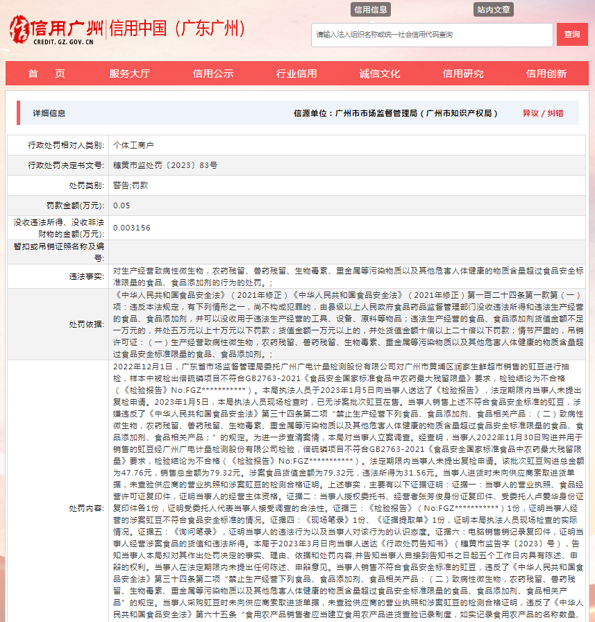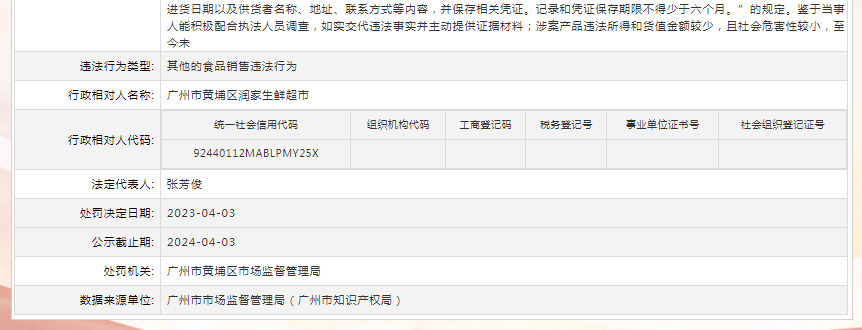中國(guó)質(zhì)量新聞網(wǎng)訊 據(jù)信用中國(guó)(廣東廣州)網(wǎng)站消息,近日,廣州市黃埔區(qū)市場(chǎng)監(jiān)督管理局對(duì)廣州市黃埔區(qū)潤(rùn)家生鮮超市作出行政處罰。行政處罰決定書文號(hào):穗黃市監(jiān)處罰〔2023〕83號(hào)。