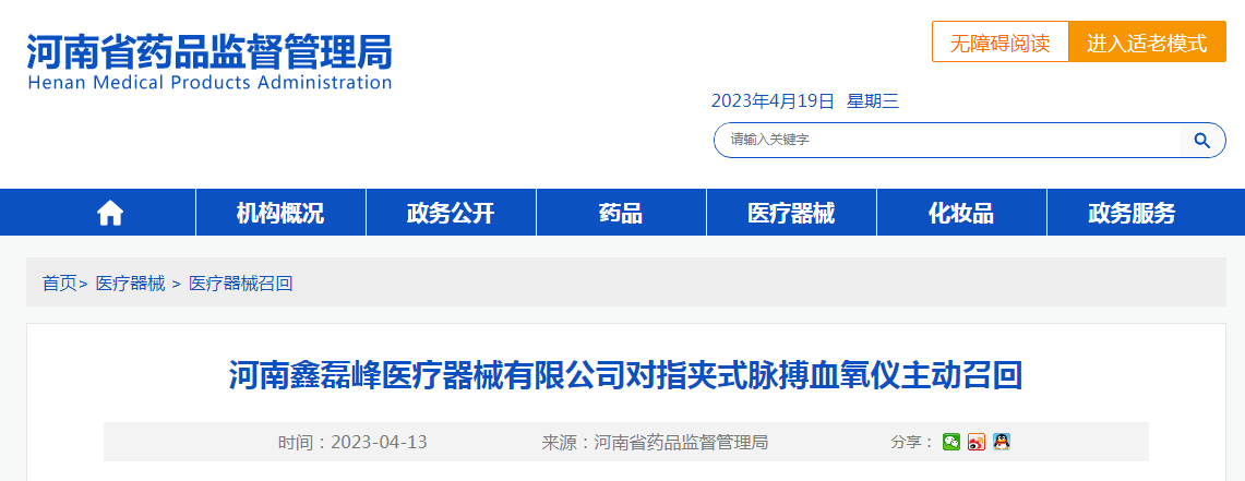 河南鑫磊峰醫(yī)療器械有限公司報告,由于其生產的指夾式脈搏血氧儀不符合規(guī)定,企業(yè)對其主動召回,召回級別為三級。召回產品的型號、規(guī)格及批次等詳細信息見《醫(yī)療器械召回事件報告表》。