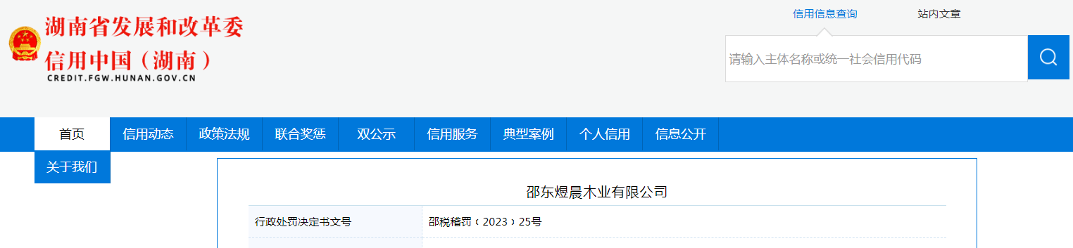 中國質(zhì)量新聞網(wǎng)訊 據(jù)信用中國(湖南)網(wǎng)站消息,近日,湖南省邵陽市稅務(wù)局對邵東煜晨木業(yè)有限公司作出行政處罰。行政處罰決定書文號:邵稅稽罰﹝2023﹞25號。