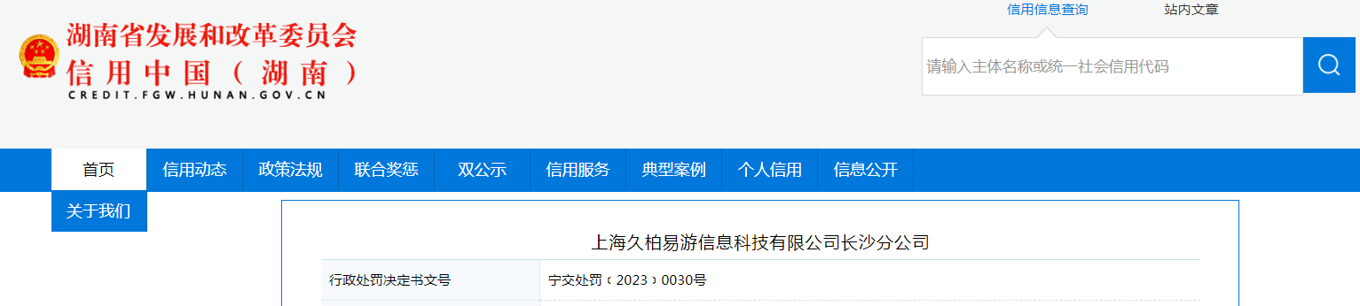 中國質量新聞網訊 據信用中國(湖南)網站消息,近日,湖南省寧鄉(xiāng)市交運局對上海久柏易游信息科技有限公司長沙分公司作出行政處罰。行政處罰決定書文號:寧交處罰﹝2023﹞0030號。