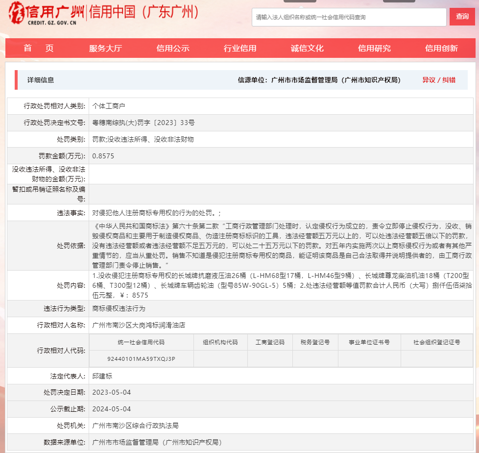 中國質(zhì)量新聞網(wǎng)訊 據(jù)信用中國(廣東廣州)網(wǎng)站消息,近日,廣州市南沙區(qū)綜合行政執(zhí)法局對廣州市南沙區(qū)大崗鴻標(biāo)潤滑油店作出行政處罰。行政處罰決定書文號:粵穗南綜執(zhí)(大)罰字〔2023〕33號。