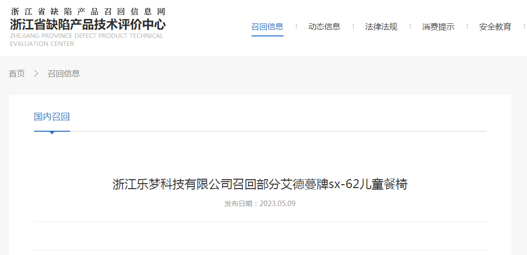 中國質(zhì)量新聞網(wǎng)訊 據(jù)浙江省缺陷產(chǎn)品召回信息網(wǎng)5月9日消息,日前,浙江樂夢科技有限公司受缺陷調(diào)查影響按照《消費(fèi)品召回管理暫行規(guī)定》的要求,主動向國家市場監(jiān)督管理總局報告了召回計劃,將自即日起,召回2020年1月1日至2020年11月10日期間制造的部分艾德蔓牌sx-62型號兒童餐椅,涉及數(shù)量為490件。