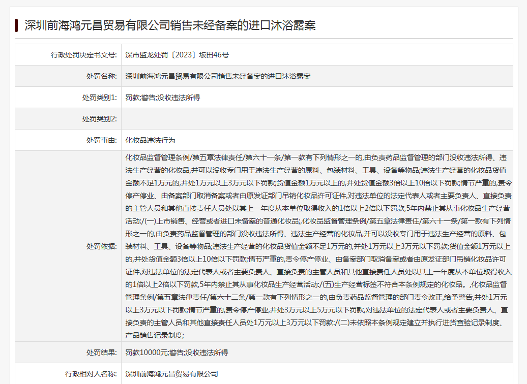 深市監(jiān)龍?zhí)幜P〔2023〕坂田46號(hào)顯示,該公司被深圳市市場(chǎng)監(jiān)督管理局龍崗監(jiān)管局罰款10000元;警告;沒(méi)收違法所得。處罰事由為:化妝品違法行為。