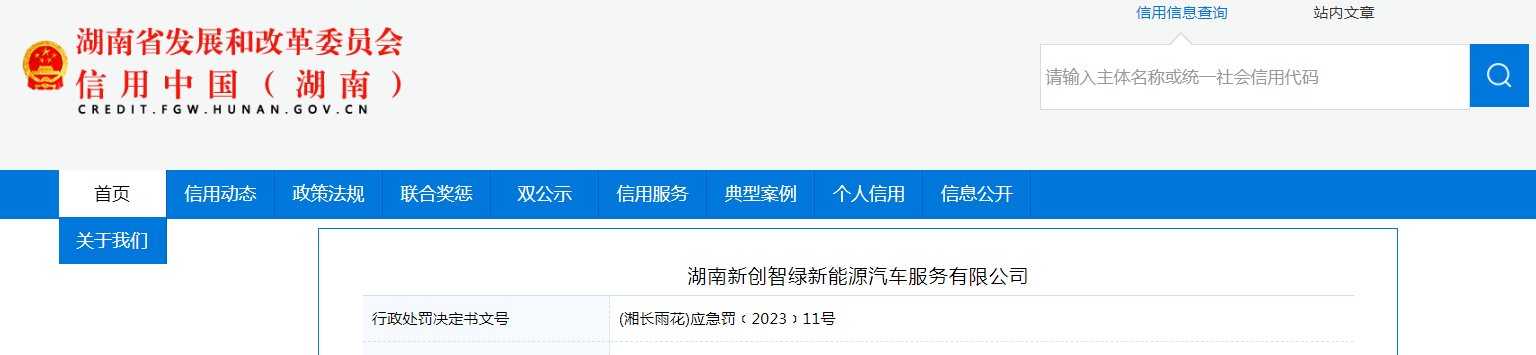 中國質(zhì)量新聞網(wǎng)訊 據(jù)信用中國(湖南)網(wǎng)站消息,近日,湖南省長沙市雨花區(qū)應(yīng)急管理局對湖南新創(chuàng)智綠新能源汽車服務(wù)有限公司作出行政處罰。行政處罰決定書文號:(湘長雨花)應(yīng)急罰﹝2023﹞11號。