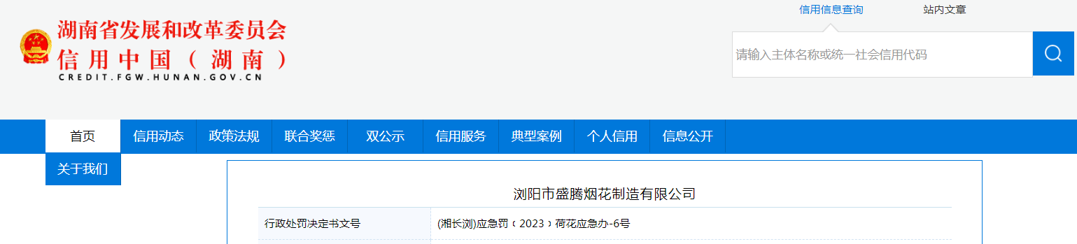 中國(guó)質(zhì)量新聞網(wǎng)訊 據(jù)信用中國(guó)(湖南)網(wǎng)站消息,近日,湖南省瀏陽(yáng)市應(yīng)急管理局對(duì)瀏陽(yáng)市盛騰煙花制造有限公司作出行政處罰。行政處罰決定書文號(hào):(湘長(zhǎng)瀏)應(yīng)急罰﹝2023﹞荷花應(yīng)急辦-6號(hào)。
