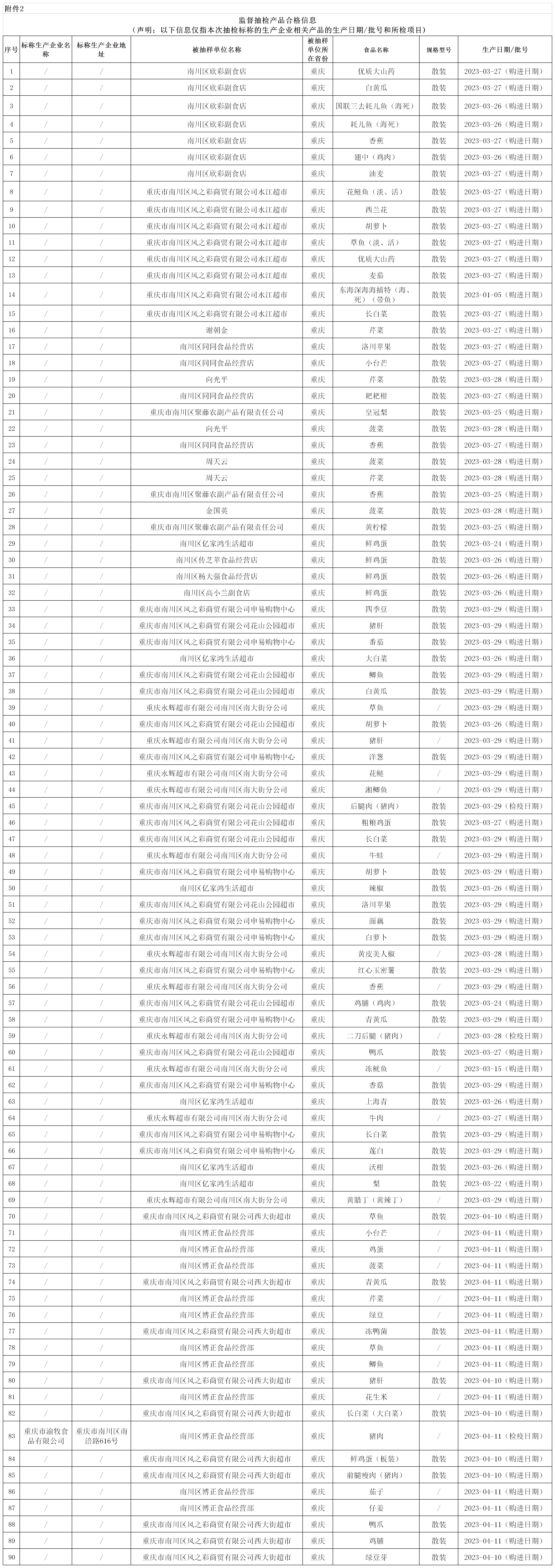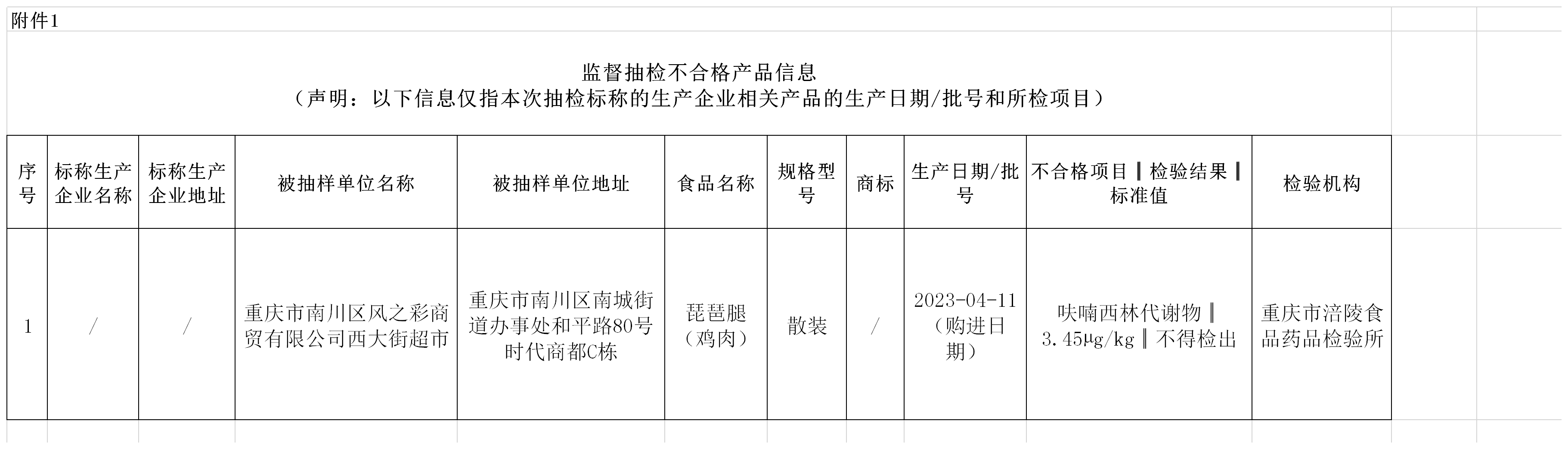 中國質(zhì)量新聞網(wǎng)訊 5月22日,重慶市南川區(qū)市場監(jiān)督管理局發(fā)布關于91批次食品安全抽檢情況的通告(2023年第5號)。本期抽檢食用農(nóng)產(chǎn)品91批次樣品。其中抽樣檢驗項目合格樣品90批次,不合格樣品1批次【琵琶腿(雞肉)】。根據(jù)食品安全國家標準,個別項目不合格,其產(chǎn)品即判定為不合格產(chǎn)品。