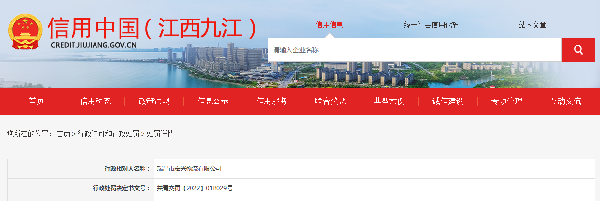 中國(guó)質(zhì)量新聞網(wǎng)訊 據(jù)信用中國(guó)(江西九江)網(wǎng)站消息,近日,江西省共青城市交通運(yùn)輸局對(duì)瑞昌市宏興物流有限公司作出行政處罰。行政處罰決定書(shū)文號(hào):共青交罰【2022】01B029號(hào)。