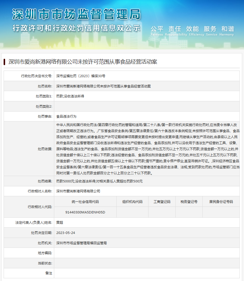中國(guó)質(zhì)量新聞網(wǎng)訊 近日,深圳市市場(chǎng)監(jiān)督管理局福田監(jiān)管局發(fā)布行政處罰信息(深市監(jiān)福處罰〔2023〕福保30號(hào)),涉及深圳市愛(ài)尚新港網(wǎng)絡(luò)有限公司未按許可范圍從事食品經(jīng)營(yíng)活動(dòng)案。