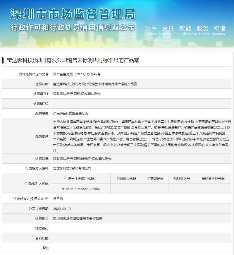 中國(guó)質(zhì)量新聞網(wǎng)訊 近日,深圳市市場(chǎng)監(jiān)督管理局寶安監(jiān)管局發(fā)布行政處罰信息(深市監(jiān)寶處罰〔2023〕松崗47號(hào)),涉及寶達(dá)娜科技(深圳)有限公司銷售未標(biāo)明執(zhí)行標(biāo)準(zhǔn)號(hào)的產(chǎn)品案。