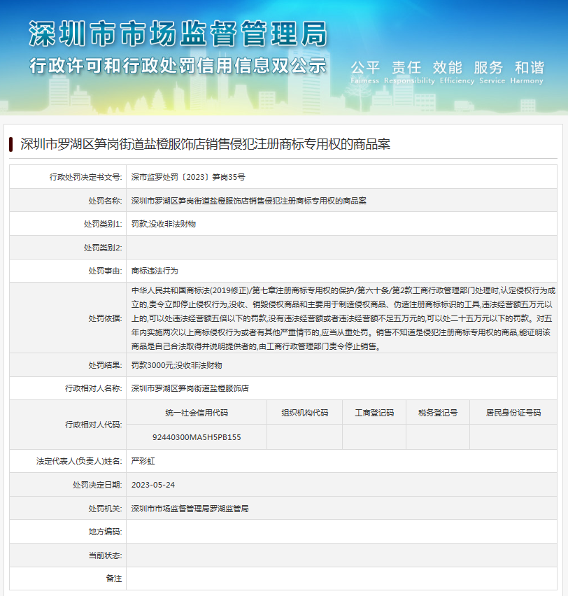 中國質量新聞網訊 近日,深圳市市場監(jiān)督管理局羅湖監(jiān)管局發(fā)布行政處罰信息(深市監(jiān)羅處罰〔2023〕筍崗35號),涉及深圳市羅湖區(qū)筍崗街道鹽橙服飾店銷售侵犯注冊商標專用權的商品案。