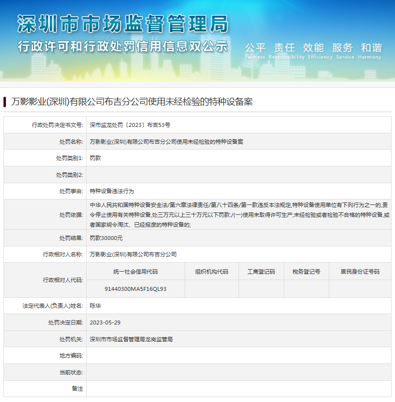 中國(guó)質(zhì)量新聞網(wǎng)訊 近日,深圳市市場(chǎng)監(jiān)督管理局龍崗監(jiān)管局發(fā)布行政處罰信息(深市監(jiān)龍?zhí)幜P〔2023〕布吉53號(hào)),涉及萬(wàn)影影業(yè)(深圳)有限公司布吉分公司使用未經(jīng)檢驗(yàn)的特種設(shè)備案。