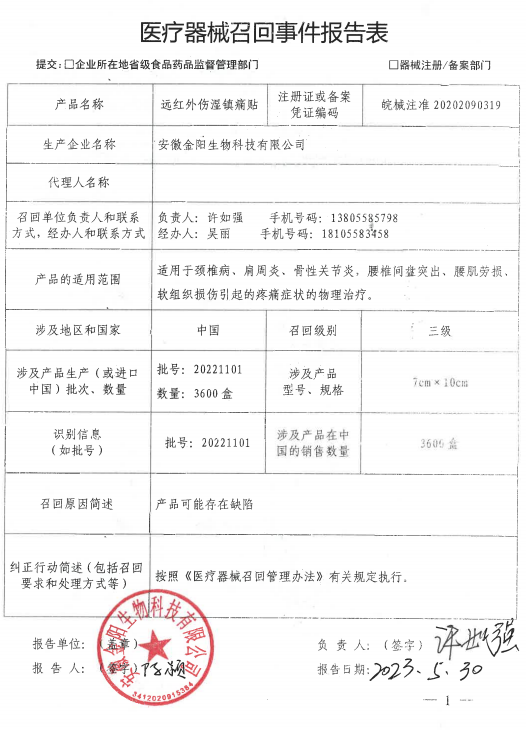 安徽金陽生物科技有限公司對其生產(chǎn)的批號20221101的遠(yuǎn)紅外傷濕鎮(zhèn)痛貼主動召回。召回級別為三級,涉及產(chǎn)品型號、規(guī)格及批次等詳細(xì)信息見醫(yī)療器械召回事件報告表。