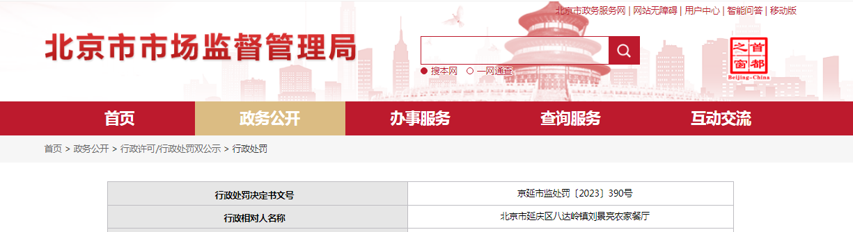 | 行政相對(duì)人名稱 | 北京市延慶區(qū)八達(dá)嶺鎮(zhèn)劉景亮農(nóng)家餐廳 | |