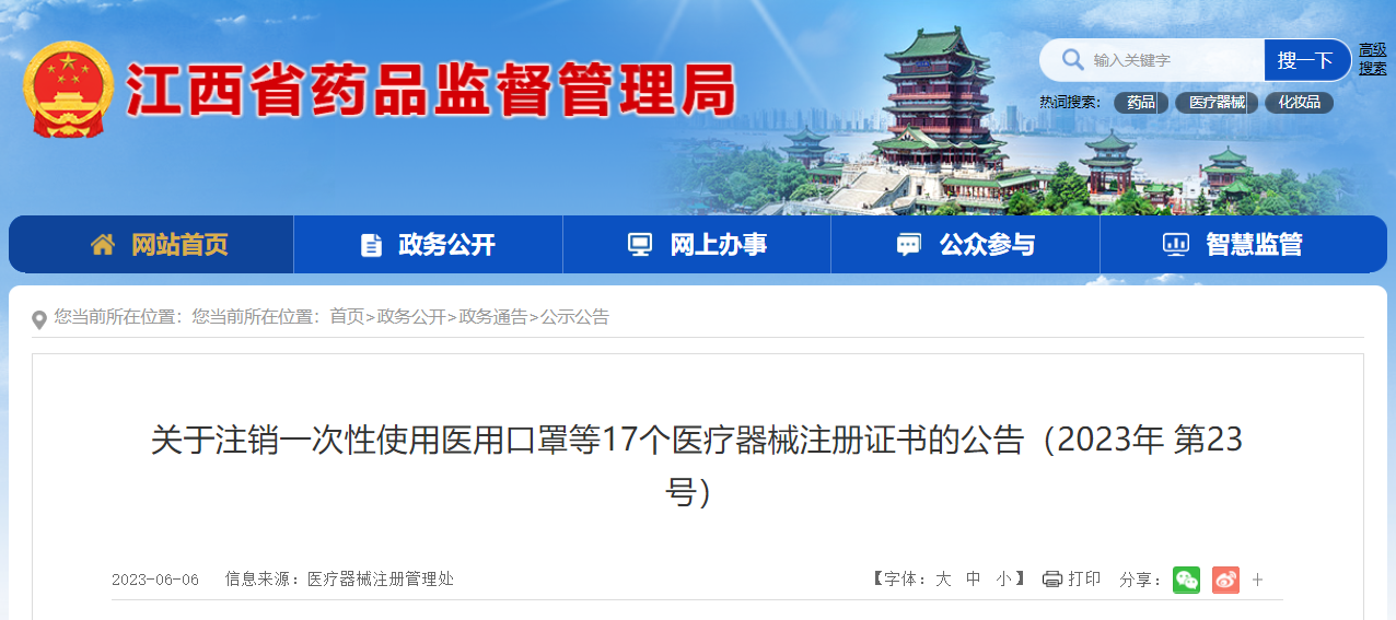 中國(guó)質(zhì)量新聞網(wǎng)訊 6月6日,江西省藥品監(jiān)督管理局網(wǎng)站發(fā)布關(guān)于注銷一次性使用醫(yī)用口罩等17個(gè)醫(yī)療器械注冊(cè)證書的公告(2023年 第23號(hào))。