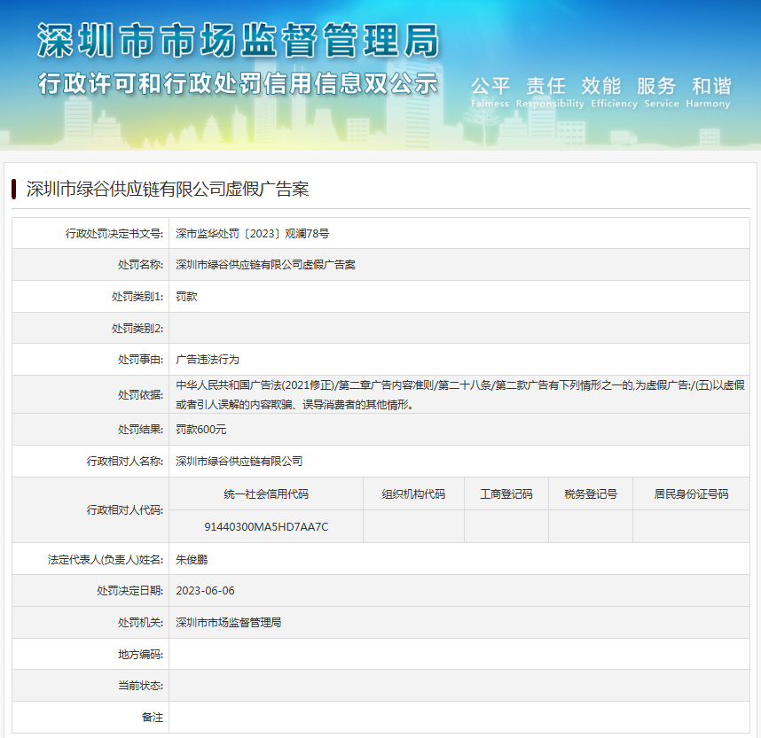 中國(guó)質(zhì)量新聞網(wǎng)訊 近日,深圳市市場(chǎng)監(jiān)督管理局發(fā)布行政處罰信息(深市監(jiān)華處罰〔2023〕觀瀾78號(hào)),涉及深圳市綠谷供應(yīng)鏈有限公司虛假?gòu)V告案。
