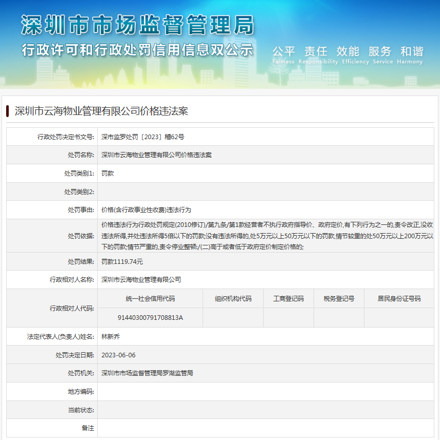 中國質(zhì)量新聞網(wǎng)訊 近日,深圳市市場監(jiān)督管理局羅湖監(jiān)管局發(fā)布行政處罰信息(深市監(jiān)羅處罰〔2023〕稽62號),涉及深圳市云海物業(yè)管理有限公司價格違法案。