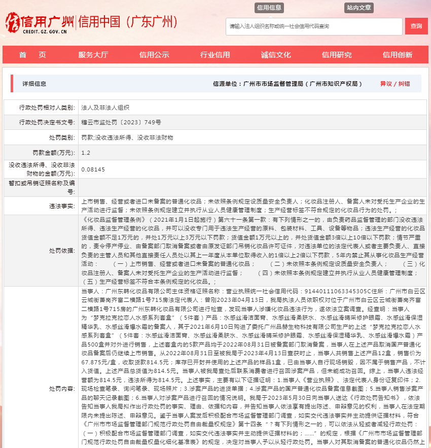中國(guó)質(zhì)量新聞網(wǎng)訊 據(jù)信用中國(guó)(廣東廣州)網(wǎng)站消息,6月8日,廣州市白云區(qū)市場(chǎng)監(jiān)督管理局對(duì)廣州東韓化妝品有限公司作出行政處罰。行政處罰決定書(shū)文號(hào):穗云市監(jiān)處罰〔2023〕749號(hào)。