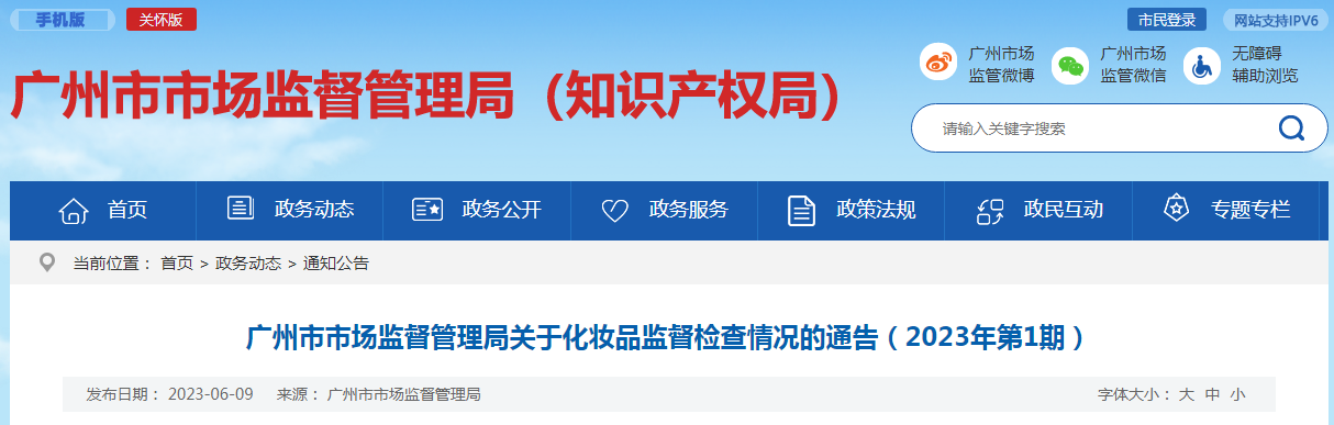 中國質(zhì)量新聞網(wǎng)訊 6月9日,廣州市市場監(jiān)督管理局網(wǎng)站發(fā)布關于化妝品監(jiān)督檢查情況的通告(2023年第1期)。