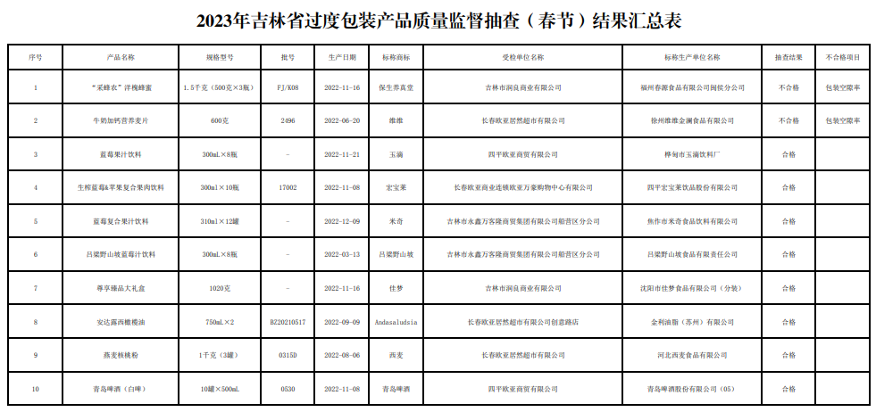 中國質(zhì)量新聞網(wǎng)訊 據(jù)吉林省市場監(jiān)管廳網(wǎng)站6月15日消息,2023年1季度,吉林省市場監(jiān)管廳組織開展了過度包裝產(chǎn)品質(zhì)量監(jiān)督抽查,共抽查6家生產(chǎn)、銷售者生產(chǎn)銷售的10批次產(chǎn)品。經(jīng)檢測,2家生產(chǎn)、銷售者生產(chǎn)、銷售的2批次產(chǎn)品不合格,涉及福州春源食品有限公司閩侯分公司、徐州維維金瀾食品有限公司等標(biāo)稱生產(chǎn)單位。