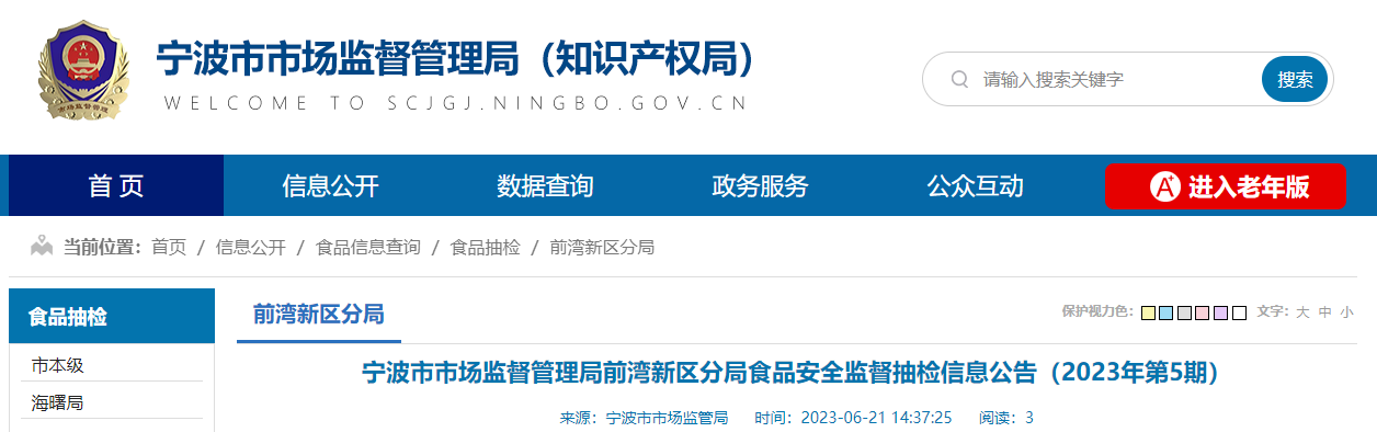 中國(guó)質(zhì)量新聞網(wǎng)訊 近日,浙江省寧波市市場(chǎng)監(jiān)督管理局前灣新區(qū)分局發(fā)布食品安全監(jiān)督抽檢信息(2023年第5期)。本期該分局對(duì)食品流通環(huán)節(jié)進(jìn)行了抽檢,共計(jì)抽檢38批次,其中合格35批次,不合格3批次。