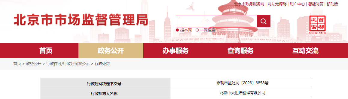 中國質(zhì)量新聞網(wǎng)訊 6月26日,北京市朝陽區(qū)市場監(jiān)督管理局對北京中天世語翻譯有限公司作出行政處罰。行政處罰決定書文號:京朝市監(jiān)處罰〔2023〕3858號。