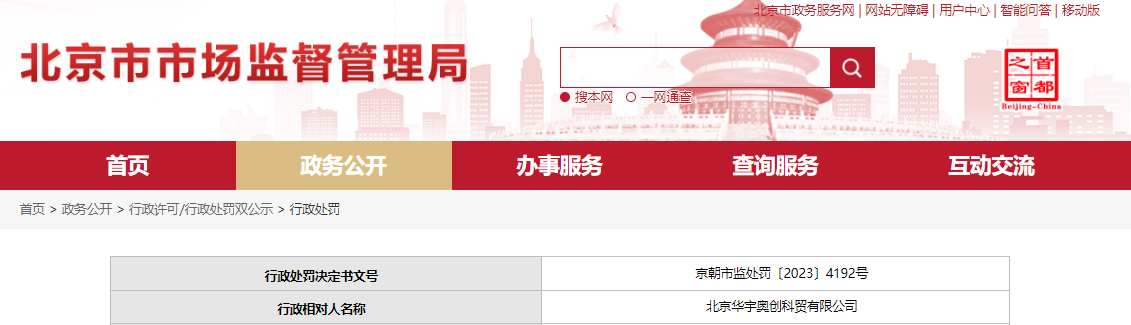中國質(zhì)量新聞網(wǎng)訊 6月26日,北京市朝陽區(qū)市場監(jiān)督管理局對北京華宇奧創(chuàng)科貿(mào)有限公司作出行政處罰。行政處罰決定書文號:京朝市監(jiān)處罰〔2023〕4192號。