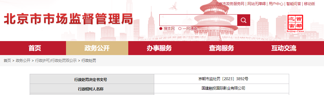 中國質(zhì)量新聞網(wǎng)訊 6月26日,北京市朝陽區(qū)市場監(jiān)督管理局對國建融投國際影業(yè)有限公司作出行政處罰。行政處罰決定書文號:京朝市監(jiān)處罰〔2023〕3892號。