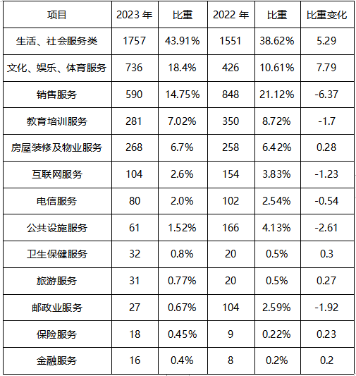 根據(jù)投訴服務(wù)分析(如圖所示),生活、社會服務(wù)類1757件,占43.91%;文化、娛樂、體育服務(wù)736件,占18.40%;銷售服務(wù)590件,占14.75%;教育培訓服務(wù)281件,占7.02%;房屋裝修及物業(yè)服務(wù)268件,占6.70%;互聯(lián)網(wǎng)服務(wù)104件,占2.60%;電信服務(wù)80件,占2.00%;公共設(shè)施服務(wù)61件,占1.52%;衛(wèi)生保健服務(wù)32件,占0.80%;旅游服務(wù)31件,占0.77%;郵政業(yè)服務(wù)27件,占0.67%;保險服務(wù)18件,占0.45%;金融服務(wù)16件,占0.40%;其中,生活、社會服務(wù)類、文化、娛樂、體育服務(wù)、銷售服務(wù)、教育培訓服務(wù)、房屋裝修及物業(yè)服務(wù)占據(jù)了消費者投訴的前5名。