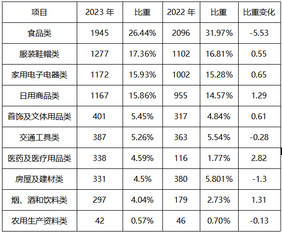 根據(jù)投訴商品分析(如圖所示),食品類1945件,占26.44%;服裝鞋帽類1277件,占17.36%;家用電子電器類1172件,占15.93%;日用商品類1167件,占15.86%;首飾及文體用品類401件,占5.45%;交通工具類387件,占5.26%;醫(yī)藥及醫(yī)療用品類338件,占4.59%;房屋及建材類331件,占4.50%;煙、酒和飲料類297件,占4.04%;農(nóng)用生產(chǎn)資料類42件,占0.57%;其中,食品類、服裝鞋帽類、家用電子電器類、日用商品類、首飾及文體用品類占據(jù)了消費者投訴的前5名。