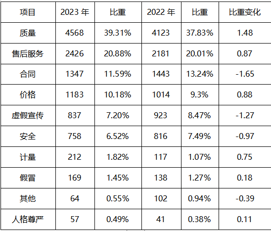 根據(jù)投訴性質(zhì)分析(如圖所示),質(zhì)量4568件,占39.31%;售后服務(wù)2426件,占20.88%;合同1347件,占11.59%;價格1183件,占10.18%;虛假宣傳837件,占7.20%;安全758件,占6.52%;計量212件,占1.82%;假冒169件,占1.45%;其他64件,占0.55%;人格尊嚴57件,占0.49%;其中,質(zhì)量、售后服務(wù)、合同、價格、虛假宣傳占據(jù)了消費者投訴的前5名。