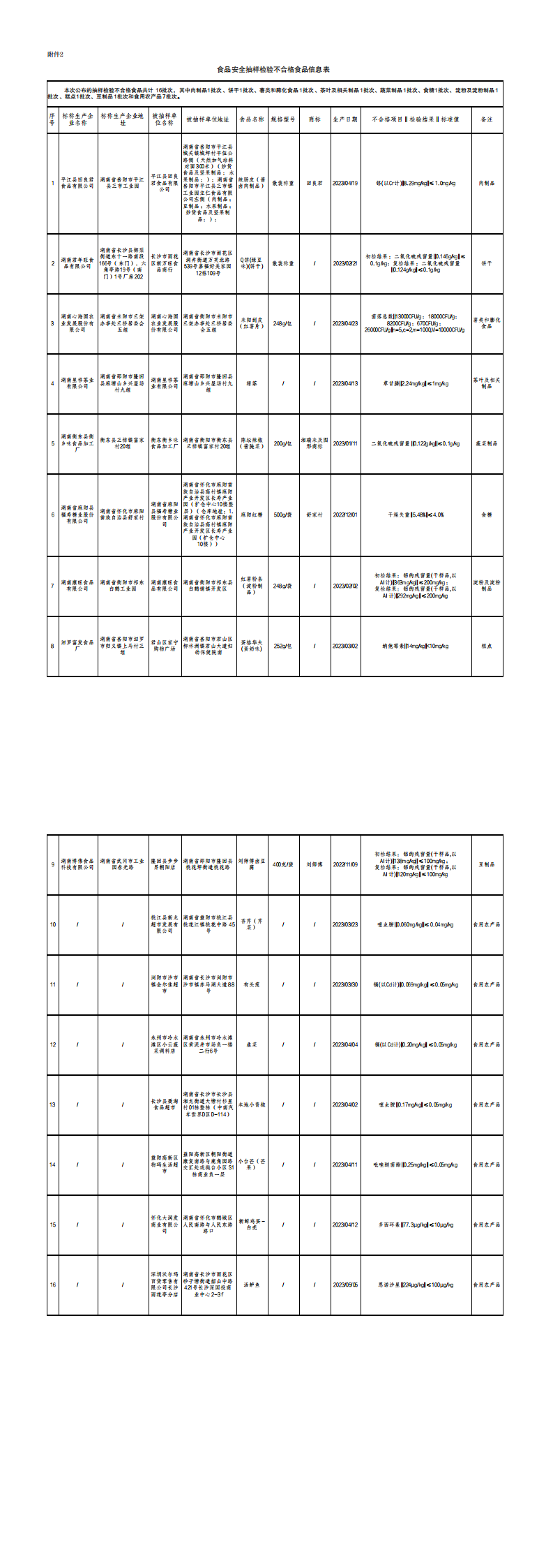 不合格產(chǎn)品包括,標(biāo)稱平江縣田良君食品有限公司生產(chǎn)的辣腸皮( 醬鹵肉制品 )、標(biāo)稱湖南君年旺食品有限公司生產(chǎn)的Q餅(綠豆味)(餅干)、標(biāo)稱湖南心海圓農(nóng)業(yè)發(fā)展股份有限公司生產(chǎn)的耒陽(yáng)刮皮(紅薯片)、標(biāo)稱湖南星移茶業(yè)有限公司生產(chǎn)的綠茶、標(biāo)稱衡東衡鄉(xiāng)味食品加工廠生產(chǎn)的陳壇辣椒( 醬腌菜)、標(biāo)稱湖南省麻陽(yáng)縣福壽糖業(yè)股份有限公司生產(chǎn)的麻陽(yáng)紅糖、標(biāo)稱湖南康旺食品有限公司生產(chǎn)的紅薯粉條(淀粉制品 )、標(biāo)稱汩羅富發(fā)食品廠生產(chǎn)的蛋格華夫(蛋奶味)、標(biāo)稱湖南博偉食品科技有限公司生產(chǎn)的劉師傅鹵豆腐。