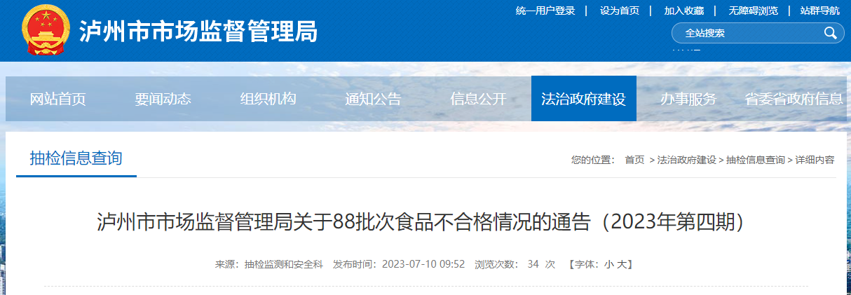 中國(guó)質(zhì)量新聞網(wǎng)訊 7月10日,四川省瀘州市市場(chǎng)監(jiān)督管理局發(fā)布關(guān)于88批次食品不合格情況的通告(2023年第四期)。通告稱,經(jīng)瀘州市市場(chǎng)檢驗(yàn)檢測(cè)中心、四川國(guó)檢檢測(cè)有限責(zé)任公司檢驗(yàn),抽取酒類、糧食加工品、蔬菜制品等24個(gè)食品大類1413批次產(chǎn)品,檢出88批次樣品不合格。發(fā)現(xiàn)的主要問(wèn)題是食品添加劑超范圍超限量使用、農(nóng)藥殘留超標(biāo)、質(zhì)量指標(biāo)不達(dá)標(biāo)、其他生物超標(biāo)、重金屬污染等。