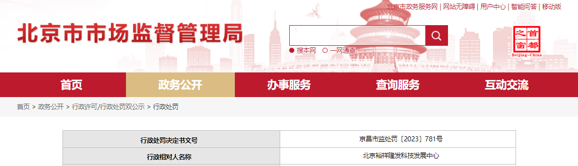 中國質(zhì)量新聞網(wǎng)訊 7月10日,北京市昌平區(qū)市場監(jiān)督管理局對北京裕祥隆發(fā)科技發(fā)展中心作出行政處罰。行政處罰決定書文號:京昌市監(jiān)處罰〔2023〕781號。