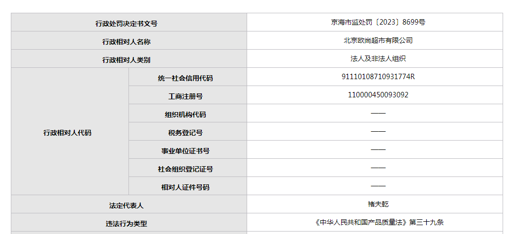 天眼查信息顯示,北京歐尚超市有限公司成立于2003年5月,注冊資本5000萬人民幣。法定代表人褚夫乾。該公司是一家以從事零售業(yè)為主的企業(yè)。公開資料顯示,該公司此前因違反《中華人民共和國產(chǎn)品質(zhì)量法》、《中華人民共和國食品安全法》等多次被市場監(jiān)管部門處罰。