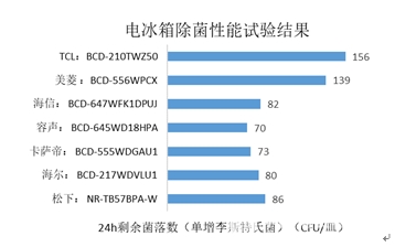 除菌性能的試驗(yàn)是將單增李斯特氏菌放入電冰箱冷藏室,測(cè)試24小時(shí)后電冰箱對(duì)細(xì)菌的去除效果。單增李斯特氏菌是一種嗜冷菌,在冰箱內(nèi)可以生長繁殖,主要以食物為傳播媒介,人感染后會(huì)引起發(fā)熱、嘔吐等癥狀。24小時(shí)剩余菌落數(shù)越少,代表電冰箱冷藏室除菌效果越好。測(cè)試的7款電冰箱中,細(xì)菌生長最少為70CFU/皿(容聲冰箱BCD-645WD18HPA型家用無霜冷藏冷凍箱),最多為156CFU/皿(TCL BCD-210TWZ50型無霜冷藏冷凍箱)。