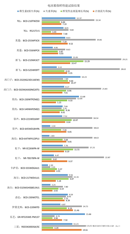 1.22款電冰箱均在說明書或網(wǎng)頁處宣稱具有“保鮮”“養(yǎng)鮮”等功能。對(duì)22款產(chǎn)品進(jìn)行了4項(xiàng)保鮮性能試驗(yàn),包括維生素C損失率(果蔬)、失重率(食材)、揮發(fā)性鹽基氮(TVB-N)增長率(肉類)、汁液流失率(肉類)試驗(yàn)。4項(xiàng)保鮮試驗(yàn)結(jié)果均呈現(xiàn)較大差異。
