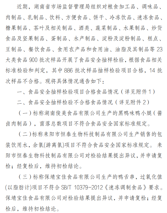 據(jù)通告,近期,湖南省市場(chǎng)監(jiān)督管理局組織對(duì)糧食加工品、調(diào)味品肉制品等23大類食品900批次樣品開展了食品安全抽樣檢驗(yàn),根據(jù)食品相關(guān)標(biāo)準(zhǔn)檢驗(yàn)和判定,其中886批次樣品抽樣檢驗(yàn)項(xiàng)目合格,14批次樣品不合格。