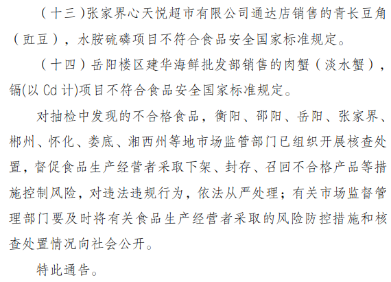 中國(guó)質(zhì)量新聞網(wǎng)訊 2023年7月18日,湖南省市場(chǎng)監(jiān)督管理局網(wǎng)站發(fā)布關(guān)于900批次食品安全抽樣檢驗(yàn)情況的通告(2023年第13期)。