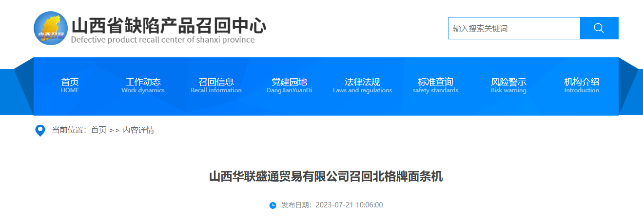中國(guó)質(zhì)量新聞網(wǎng)訊 據(jù)山西省缺陷產(chǎn)品召回中心網(wǎng)站7月21日消息,日前,山西華聯(lián)盛通貿(mào)易有限公司按照《消費(fèi)品召回管理暫行規(guī)定》的要求,主動(dòng)向山西省市場(chǎng)監(jiān)督管理局報(bào)告了召回計(jì)劃,決定自即日起,召回2022年10月18日生產(chǎn)的北格牌面條機(jī),涉及數(shù)量為28臺(tái)。