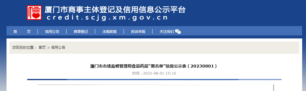 中國(guó)質(zhì)量新聞網(wǎng)訊 據(jù)廈門市商事主體登記及信用信息公示平臺(tái)消息,近日,廈門市市場(chǎng)監(jiān)督管理局公示食品藥品“黑名單”信息(20230801)。