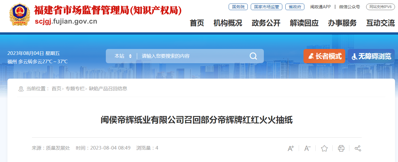 中國質(zhì)量新聞網(wǎng)訊 據(jù)福建省市場監(jiān)管局網(wǎng)站8月4日消息,日前,閩侯帝輝紙業(yè)有限公司按照《消費品召回管理暫行規(guī)定》的要求,向福建省市場監(jiān)督管理局報告了召回計劃,將自即日起,召回2021年7月2日制造的部分型號規(guī)格為130mm×180mm×270張(±5%),生產(chǎn)批號為210702的帝輝牌紅紅火火抽紙,涉及數(shù)量為100提。