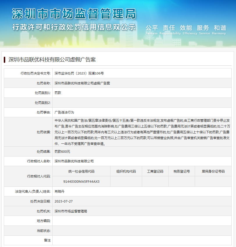 中國質(zhì)量新聞網(wǎng)訊 日前,深圳市市場監(jiān)督管理局發(fā)布行政處罰信息(深市監(jiān)華處罰〔2023〕觀瀾106號),涉及深圳市品聯(lián)優(yōu)科技有限公司虛假廣告案。