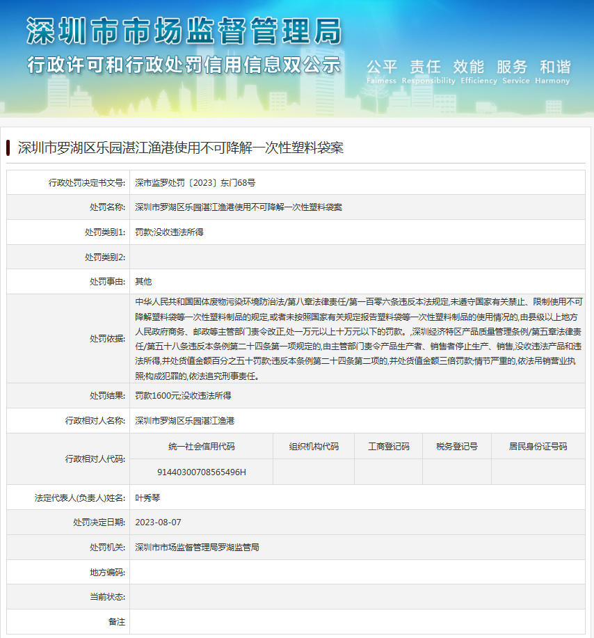 中國質(zhì)量新聞網(wǎng)訊 近日,深圳市市場監(jiān)督管理局羅湖監(jiān)管局發(fā)布行政處罰信息(深市監(jiān)羅處罰〔2023〕東門68號),涉及深圳市羅湖區(qū)樂園湛江漁港使用不可降解一次性塑料袋案。